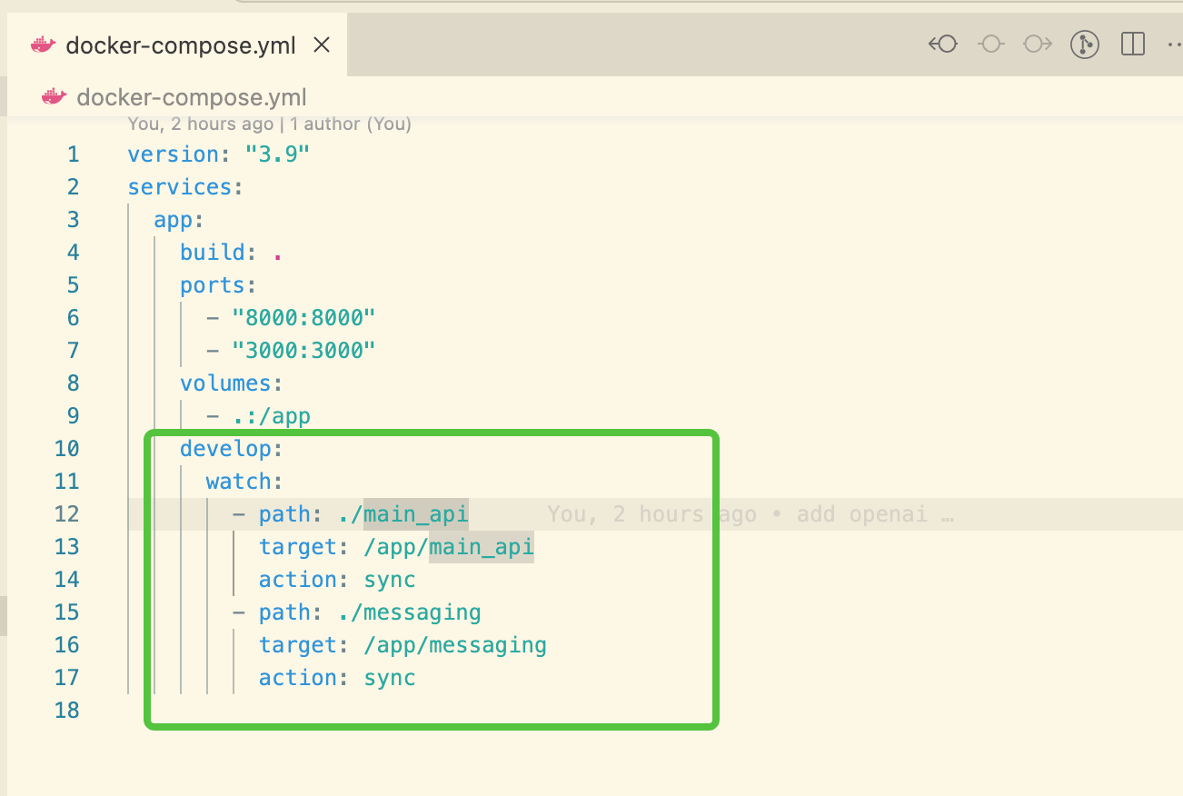 In `docker-compose.yml`, you can use Compose Watch to watch specific directories for changes.