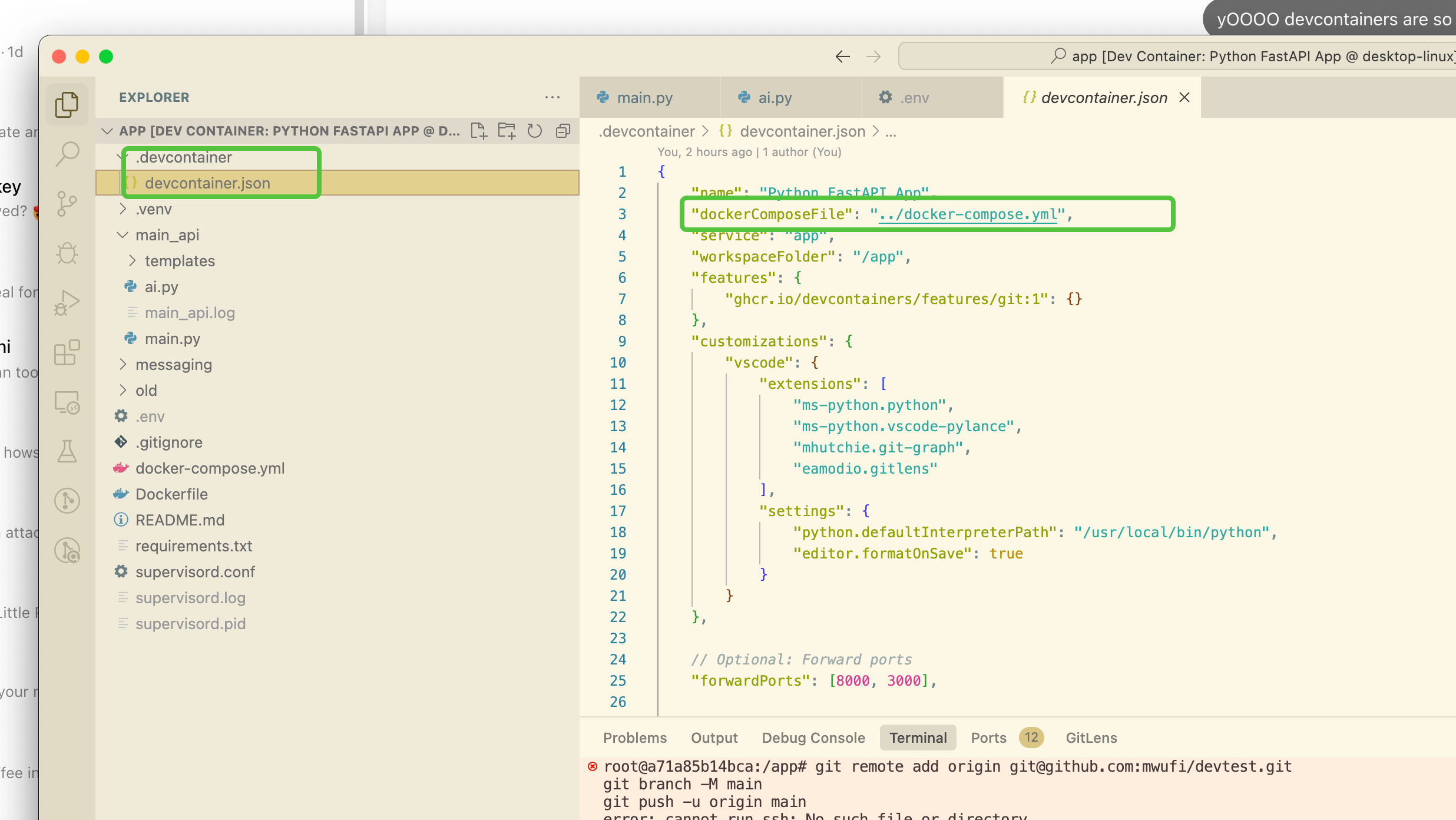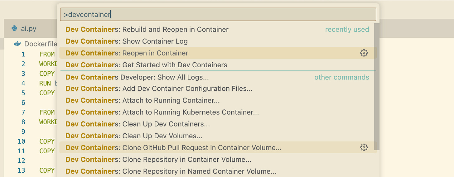 Once you have this “.devcontainer” folder, you can just open it in VSCode via Cmd+Shift+P, and selecting “Reopen in Container”